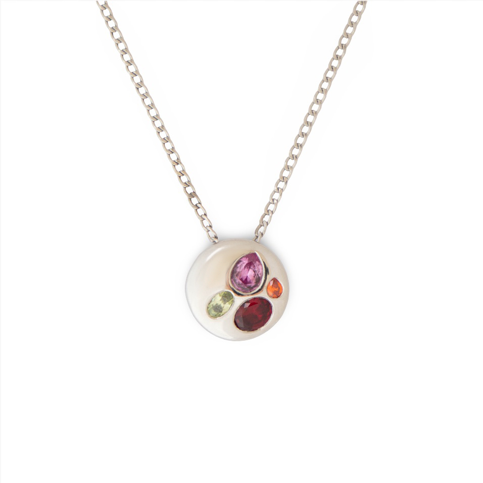Ez a különleges nyaklánc a természet szépségét idézi meg a kör alakú medál és a finom, színes cirkónia kövek harmóniájában. A medál letisztult formája és a játékos színek elegáns kontrasztot alkotnak, így a darab egyszerre ragyog hétköznapokon és különleges alkalmakon.