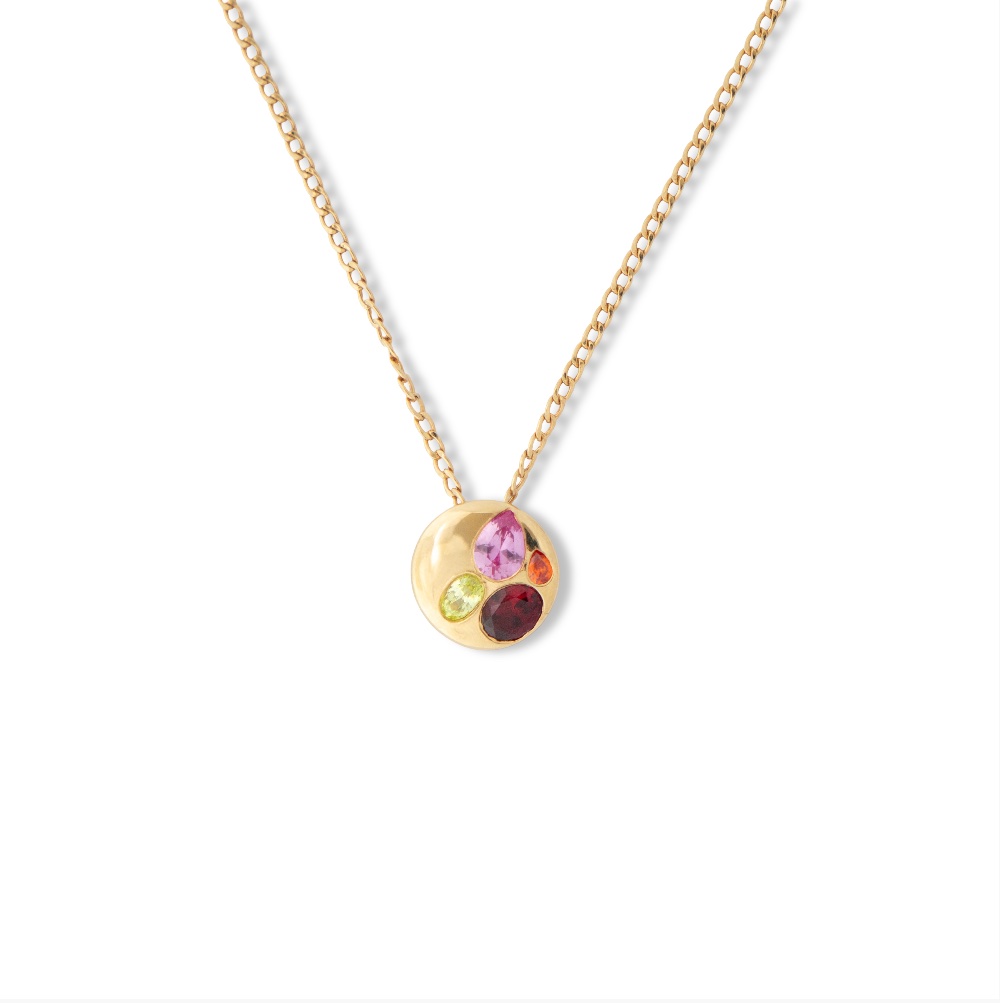 Ez a különleges nyaklánc a természet szépségét idézi meg a kör alakú medál és a finom, színes cirkónia kövek harmóniájában. A medál letisztult formája és a játékos színek elegáns kontrasztot alkotnak, így a darab egyszerre ragyog hétköznapokon és különleges alkalmakon.