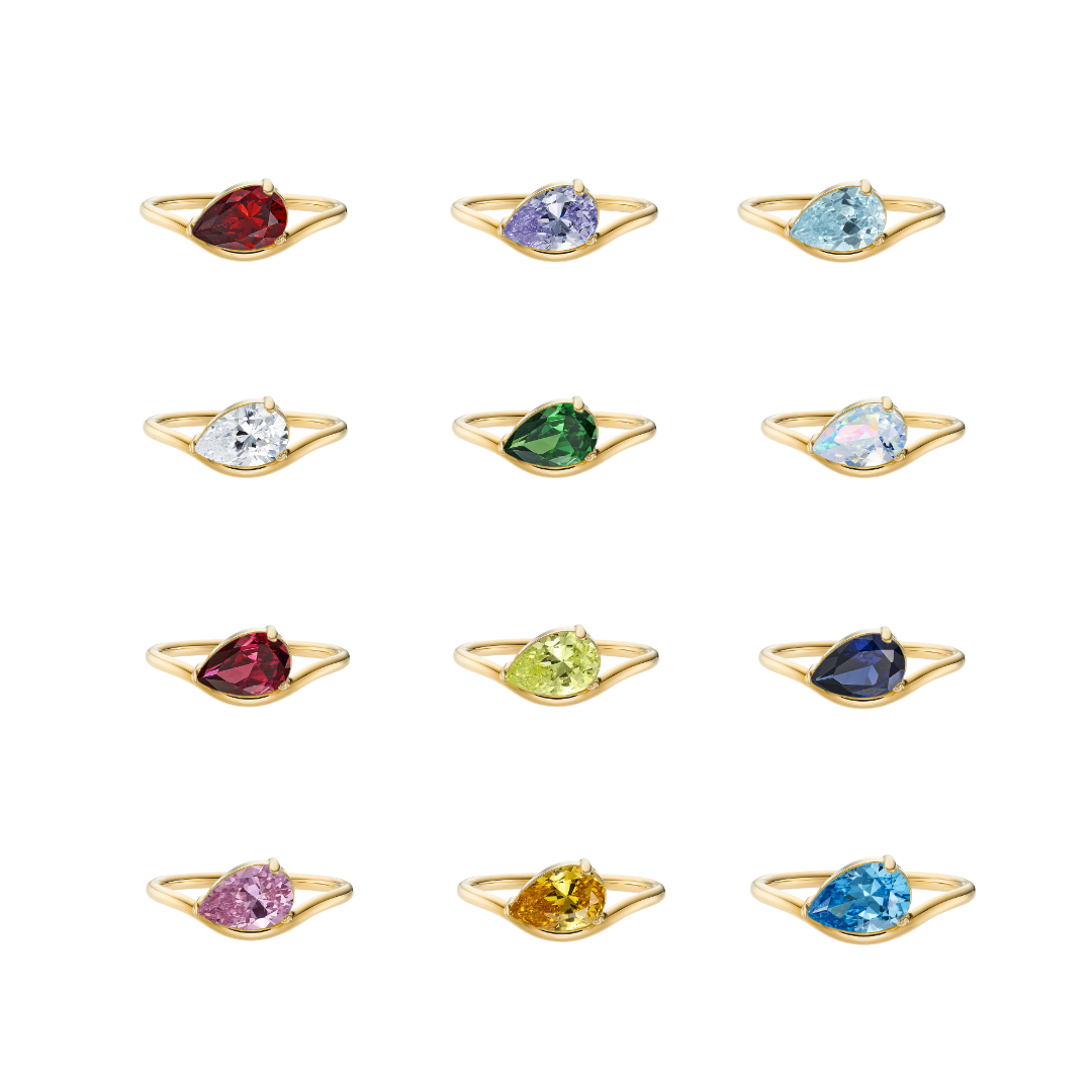 Április – Fehér topáz, Augusztus – Peridot, December – Kék topáz, Február-Ametiszt, Január-Gránát, Július – Rubin, Június – Holdkő, Május – Zöld onix, Március – Akvamarin, November – Citrin, Október – Fehér opál, Szeptember – Kék zafír