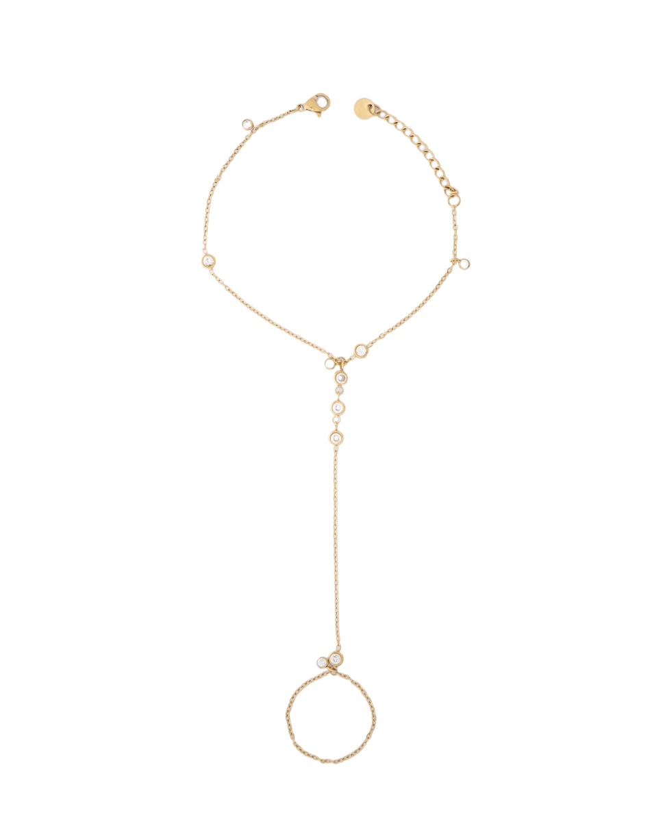 A Starlit kézlánc letisztult és elegáns designja ötvözi a modern minimalizmust a finom nőiességgel. A láncon apró, csillogó cirkónia bezel díszek találhatók, amelyek játékos fényt adnak minden mozdulatnak. Finoman öleli körbe a csuklót és az ujjak vonalát, miközben egyedi stílust kölcsönöz viselőjének. Akár különleges alkalomra, akár a mindennapokhoz, ez a kézlánc ideális kiegészítő, amely szofisztikáltan emeli ki a kezed vonalát.